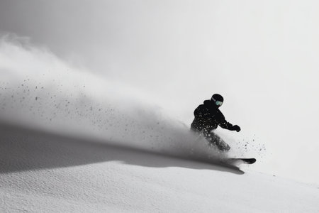 A lone skier carves gracefully through fresh powder on a serene winter morning. The pristine snow glistens under the soft light of dawn, creating a magical atmosphere in the breathtaking mountain landscape.
