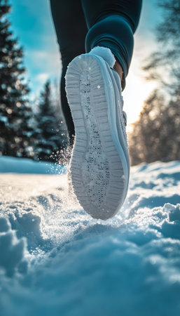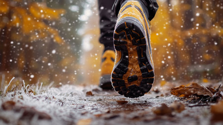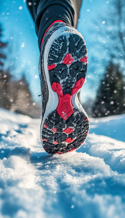 Close up shot of a sneaker in motion during a snowy jogging session on a winter day