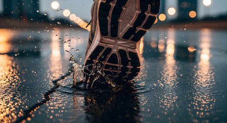 Close-up of a runner's shoe stepping into a puddle on a wet asphalt street at night, creating a dynamic water splash. The bokeh lights of the city in the background create a mood of urban fitness and determination.