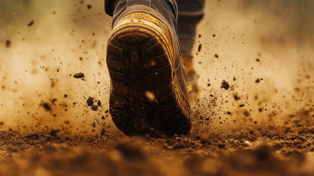 A dynamic close-up of a boot in motion, creating dust clouds on a rugged outdoor trail. Perfect for themes of adventure and athleticism.