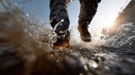 A vibrant close-up capturing a person walking through water, creating dynamic splashes under warm sunlight, evoking a sense of adventure and freedom.