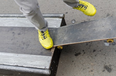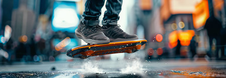 Close-up of hoverboard, hoverboard rider's legs, floating in the air in the city, future of air vehicles.