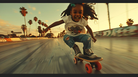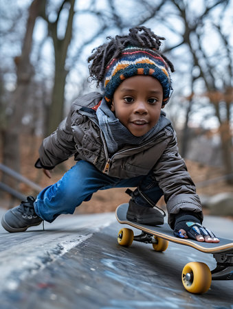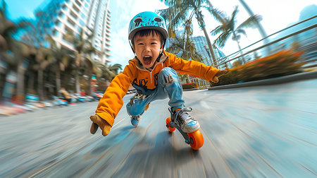 A young child boy is riding a roller skates down a road. The child is happy and smiling. Concept of joy and excitement as the child enjoys the thrill of rollerskating