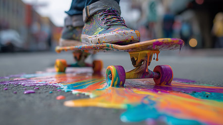 Skateboarder riding on a vibrant wet surface with rainbow colors and splashing water droplets. Extreme sport lifestyle concept