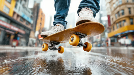 A Skateboarder riding on wet city street, showcasing vibrant urban life