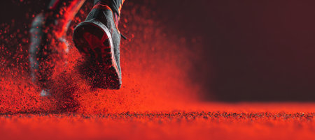 A runner's foot captured in a dynamic push-off moment on a red track surface, showcasing motion and speed. The cinematic photography highlights the energy and intensity of athletic performance.
