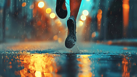 Close-up of a person running on a wet street. Runner jogs through puddles in an urban setting. Concept of fitness, urban exercise, street running, and nighttime activity.
