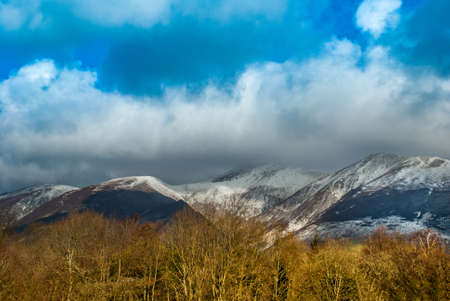 Stunning landscape image of Skiddaw snow capped mountain range in Lake District in Winter with low level cloud around peaks