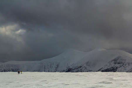 Snow covered Carpathian mountain hills with far away hikers tourists in winter