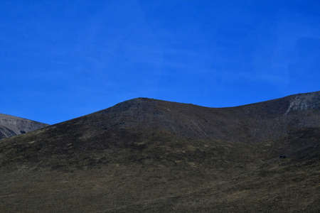 Minimalist alpine landscape with sunlight on mountain silhouette under blue sky with clouds. Scenic view to large mountain under cloudy sky. Minimal nature background with light and dark on mountain.