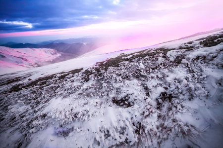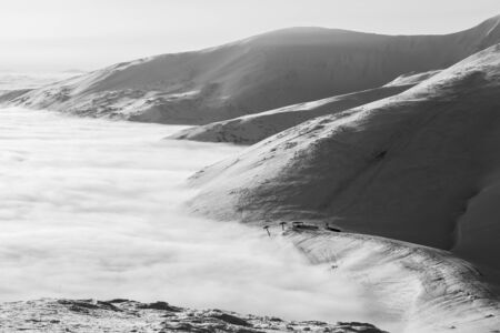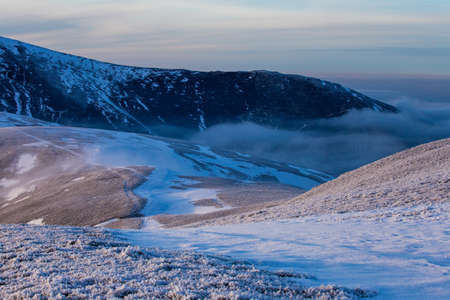 Snow covered mountain top with fog at Carpathian mountains, Ukraine.