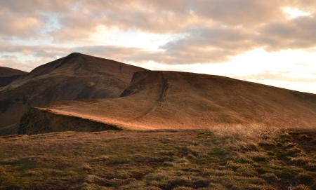 Stunning golden light of sunrise on side of Low Fell in the English Lake District countryside during late Summer