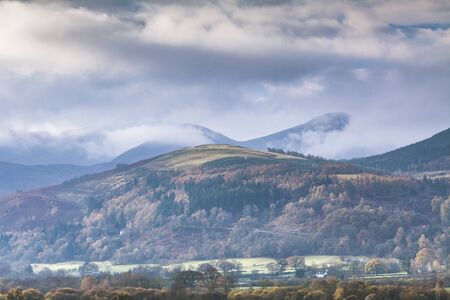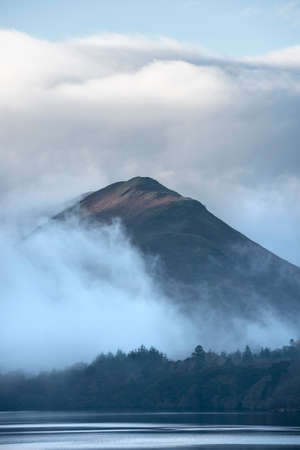 Beautiful landscape image of Blencathra covered in low cloud fog and mist viewed from Walla Crag in Lake District