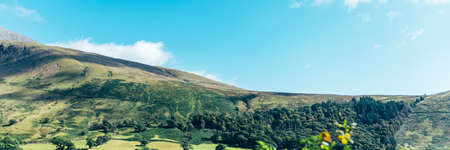 Sunset over green hills in Yorkshire Dales, Cumbria. Rural landscape, north UK.