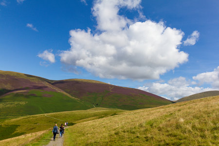 Keswick, United Kingdom - 13 August, 2017: People hiking in Latrigg hill across mount Skddaw overlooking Keswick and lake Derwent Water, Cumbria, UK