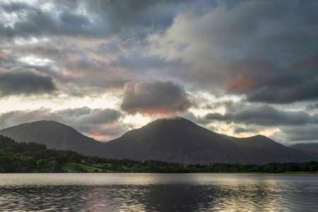 Epic landscape image across Bassenthwaite Lake in Lake District suring dramatic Autumn evening