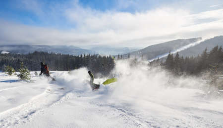 Freeride skiers carving down snowy mountain slope creating powder clouds. Freeride skiing