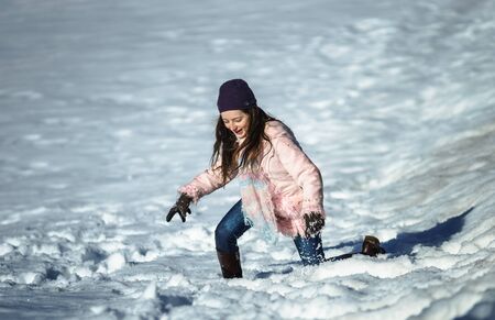 Cute teenage girl playing in white snow, sunny winter day, Alsace
