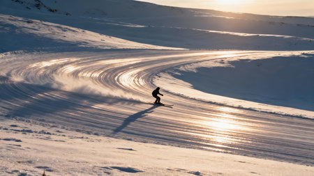 A lone skier carves gracefully through fresh powder on a serene winter morning. The pristine snow glistens under the soft light of dawn, creating a magical atmosphere in the breathtaking mountain landscape.