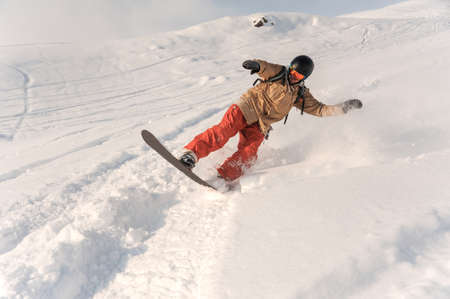 Male snowboarder in sportswear and helmet riding down the powder snow hill on the sunny day