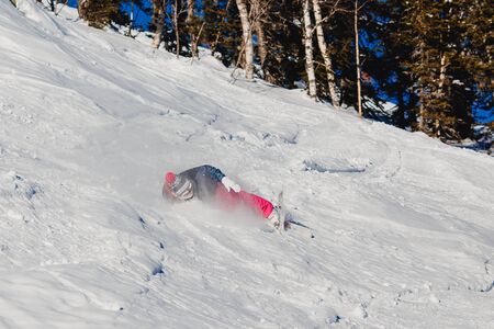 Snowboarder in the moment of falling on the snowy slope at a ski resort in the mountains. Winter vacation