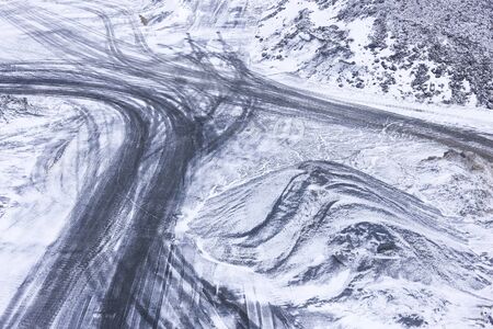 Snowy off-piste slope with traces of skis, snowboards and snow grooming machine at sunny winter day