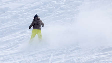 Snowboarder downhill on snowy ski trace at sunny cold day. Caucasus Mountains in winter, Georgia, region Gudauri, mount Kudebi.