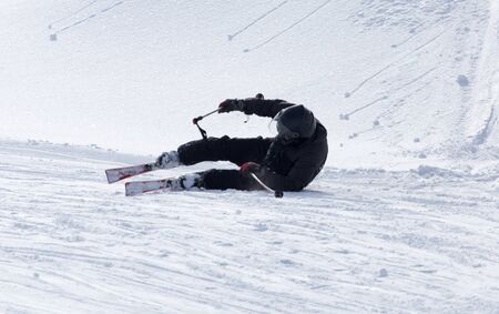 Sheregesh, Kemerovo region, Russia - April 16, 2016: novice skier slides down the slope and falls