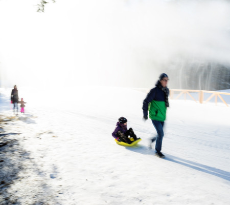 Father with daughter in a sledge ride in motion blur. Defocused image