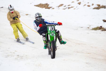 City Cesis, Latvia, Winter motocross, Driver with motorcycle and skier. Travel photo. 2018 Fast speed. Ice and snow.