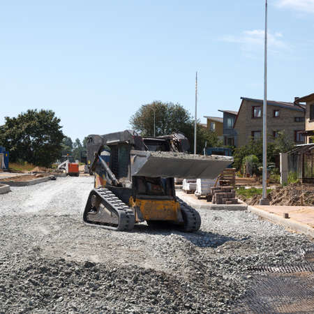 Excavator at construction site mini loader bobcat transports crushed stone to different construction places