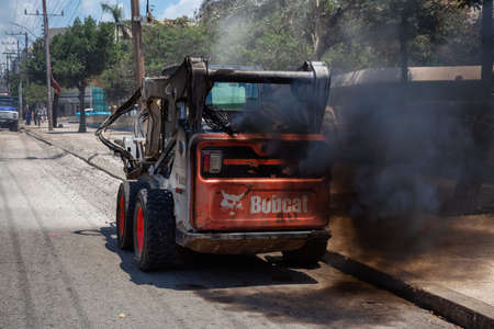 Havana, Cuba - May 29, 2019: Heavy equipment construction machine working in the streets of Havana City, Capital of Cuba, emitting black smoke into the air.