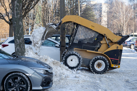Skid-steer loader working at construction site. Compact construction equipment for work in limited conditions.