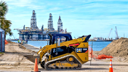 PORT ARANSAS, TX - 29 FEB 2020: Yellow CAT 289D front loader with an empty bucket, used to carry dirt at a construction site, across the water from three oil rigs in dry dock.