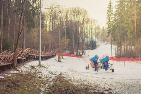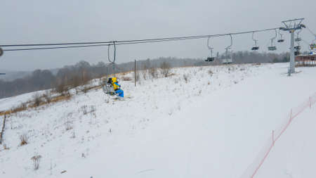 Ruzomberok, Slovakia - December 30, 2025: Front view of snowmaking machine producing artificial snow on ski slope at Malino Brdo ski resort, highlighting snow production technology, winter preparation and ski resort infrastructure.