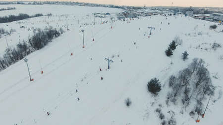 Ski resort. A queue of snowboarders and skiers at the T-bar. Shooting from a drone.
