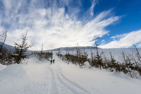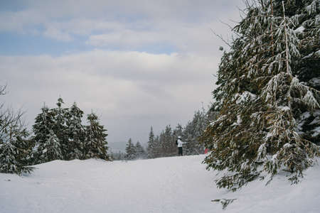 Beautiful panorama taken in polish mountains Beskidy on the way to Hala Lipowska during snowy winter. Landscape with man captured during skitour trekking.