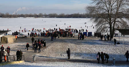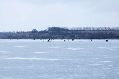 Many people on ice, winter fishing, frozen river in winter, ice fishing