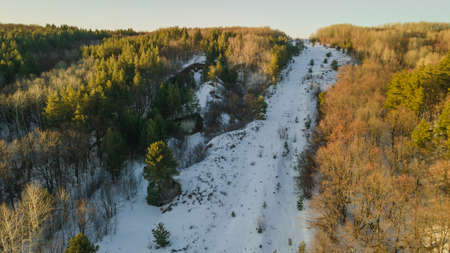 Aerial view of road passing through the snow-covered winter forest. Top view