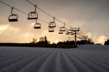 VALCA, SLOVAKIA - JANUARY 22, 2022: Empty chairs at ski-lift chair at resort Snowland Valca in winter season.