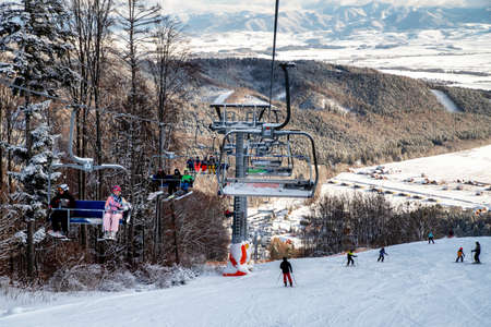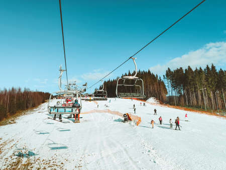 VALCA, SLOVAKIA - JANUARY 22, 2022: People sitting on chairlift and snowboarder on slope at mountain resort. at mountain resort SNowland