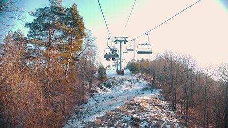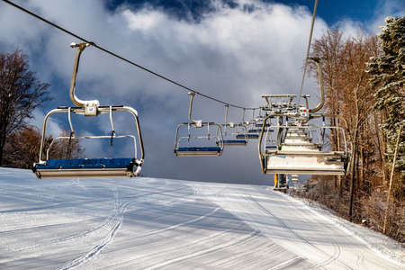 KRUSETNICA, SLOVAKIA - JANUARY 15, 2021: Empty chairs on ski-lift at resort Krusetnica in winter season.