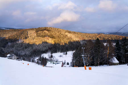Winter mountains panorama with ski slopes and ski lifts in a cloudy day. Sunset soft light with dramatic orange sky. Vintage toning effect. Bukovel, Carpathians, Ukraine, Europe