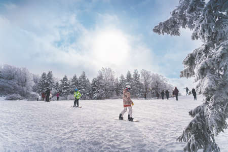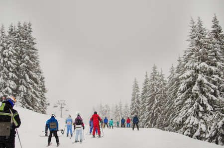 Paltinis Arena Platos, Romania - January 11, 2020. Lots of people on a mountain slope at ski resort in Paltinis Arena Platos. Paltinis Arena Platos is a most popular ski resort in Sibiu, Romania