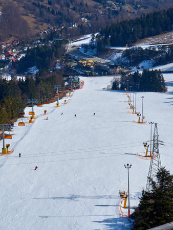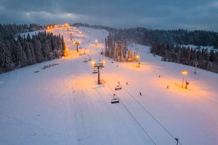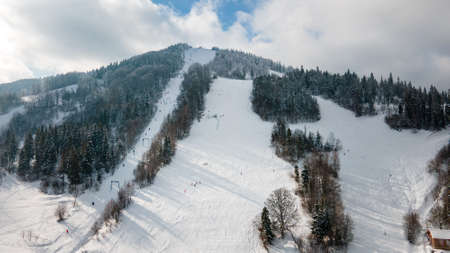 Drone view on ski slope in Polish Beskid mountains. Winter sports
