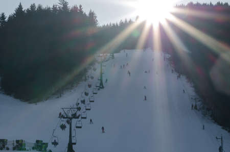 Ski resort with ski-lift. Day, sun is shining, people having fun riding ski and snowboard.