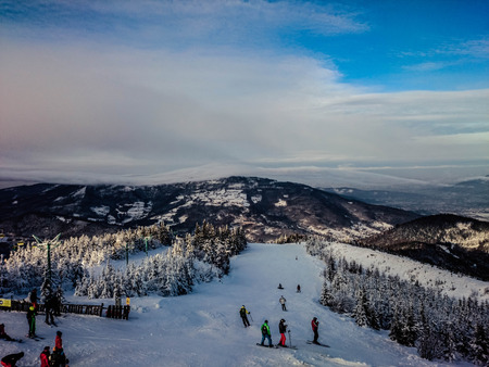 BUKOVEL, UKRAINE - December 17, 2016: Snowboarder and skiers enjoying on slopes of ski resort Bukovel. Bukovel is the most popular ski resort in Ukraine. Ski season and Winter sports concept