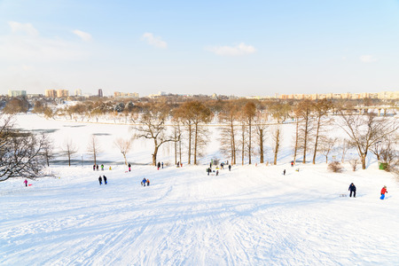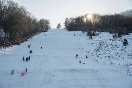 People sledge downhill in the winter