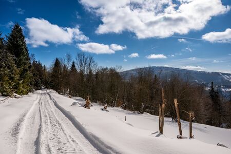 road in winter mountains rides cars and snow scooters, beautiful blue sky, slovakia beskidy, beskid mountains