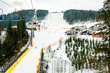 Lift and ski slope with skiers below it on a sunny winter day with blue sky, ski resort Bukovel. 2019